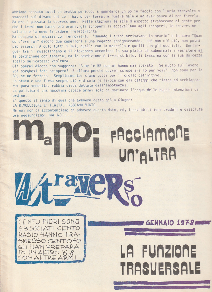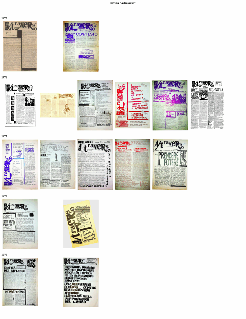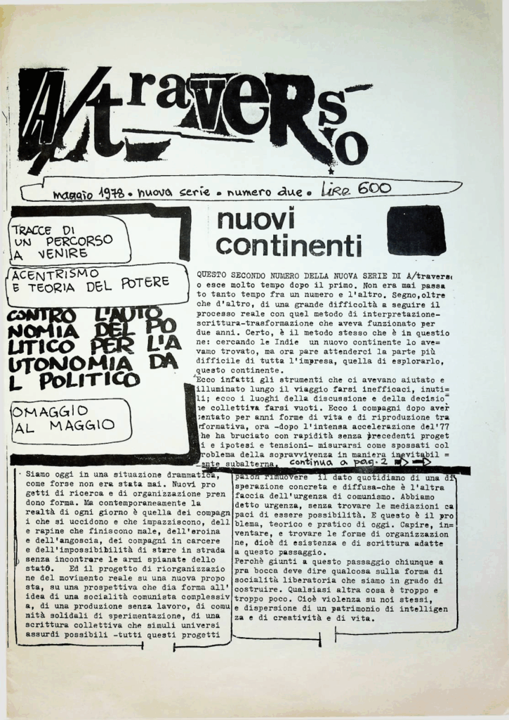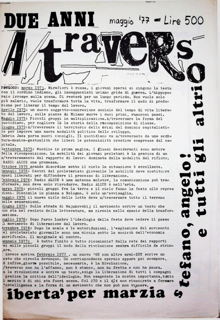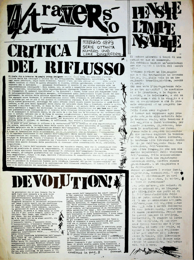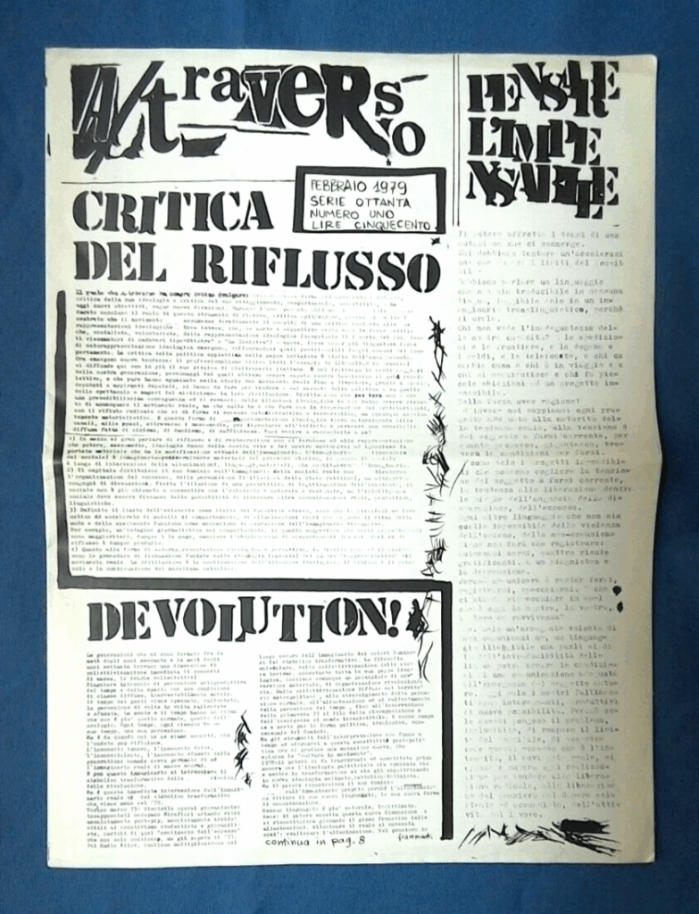 BERARDI Franco (BIFO) – TORREALTA Maurizio (fondatori). A/traverso. Giornale per l’autonomia. Senza dati tipografici, Febbraio 1979, Numero uno Serio Ottanta.
