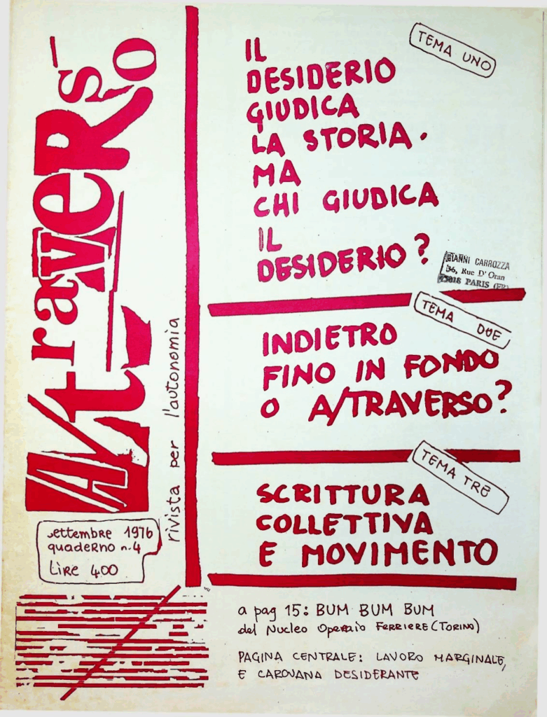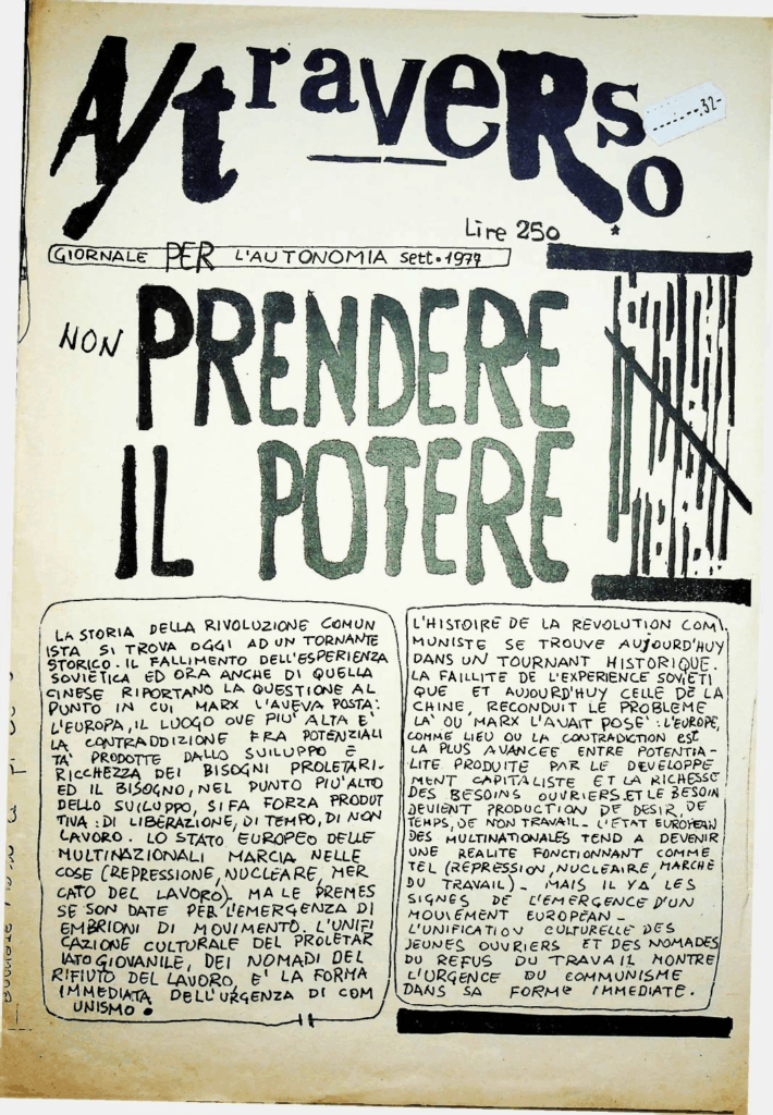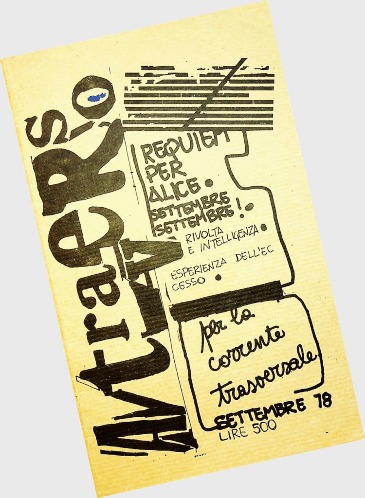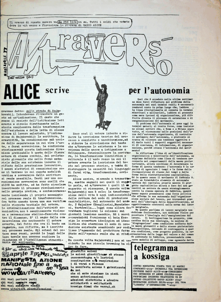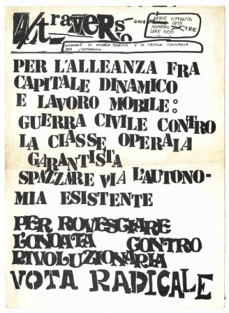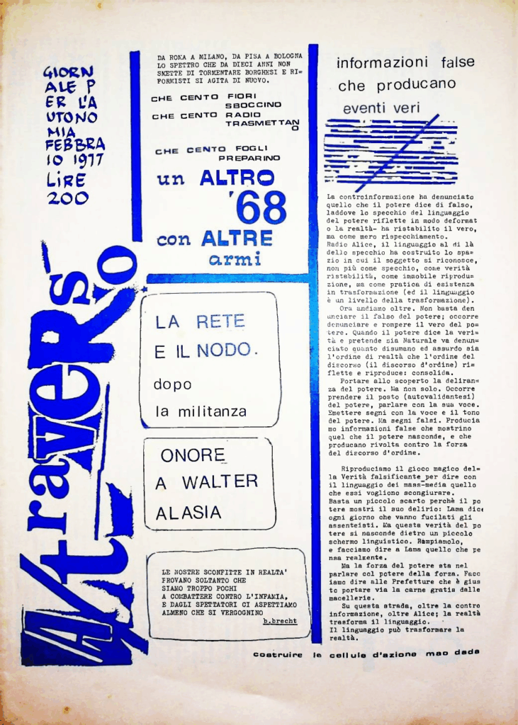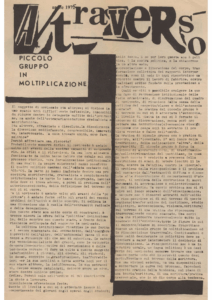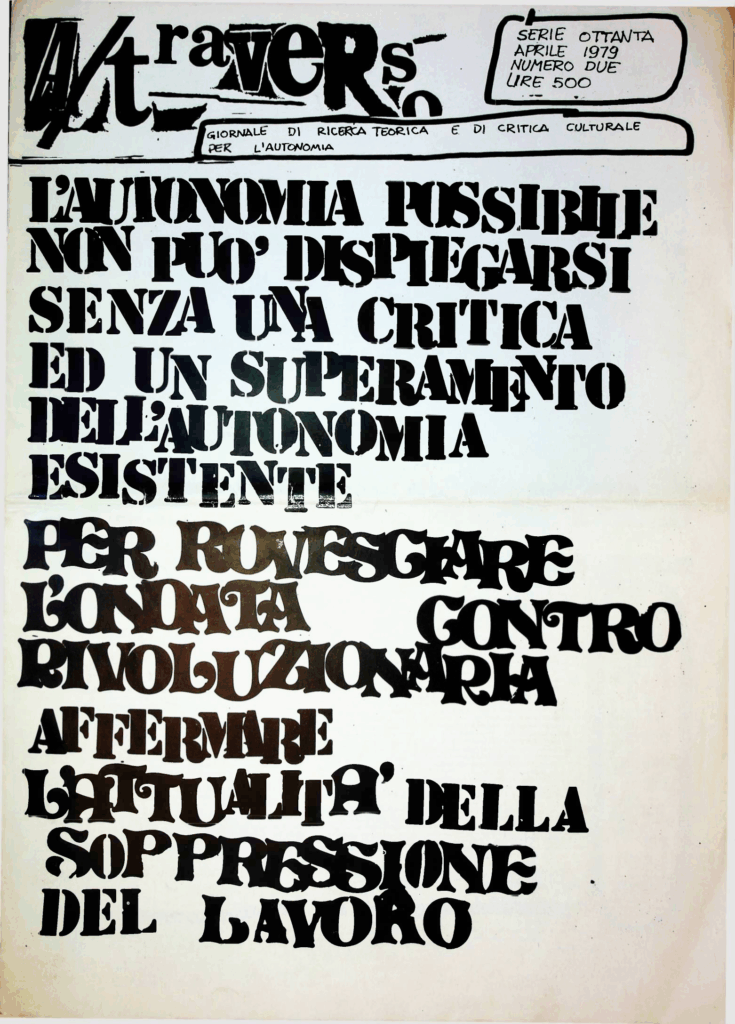 BERARDI Franco (BIFO) – TORREALTA Maurizio (fondatori). A/traverso. Giornale per l’autonomia. Senza dati tipografici, Febbraio 1979, Numero uno Serio Ottanta.