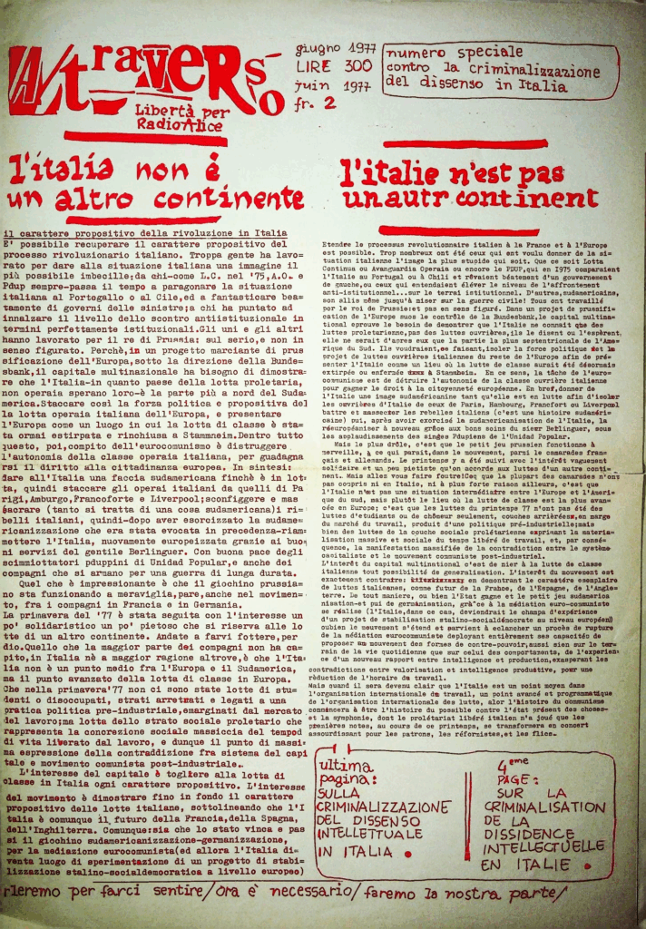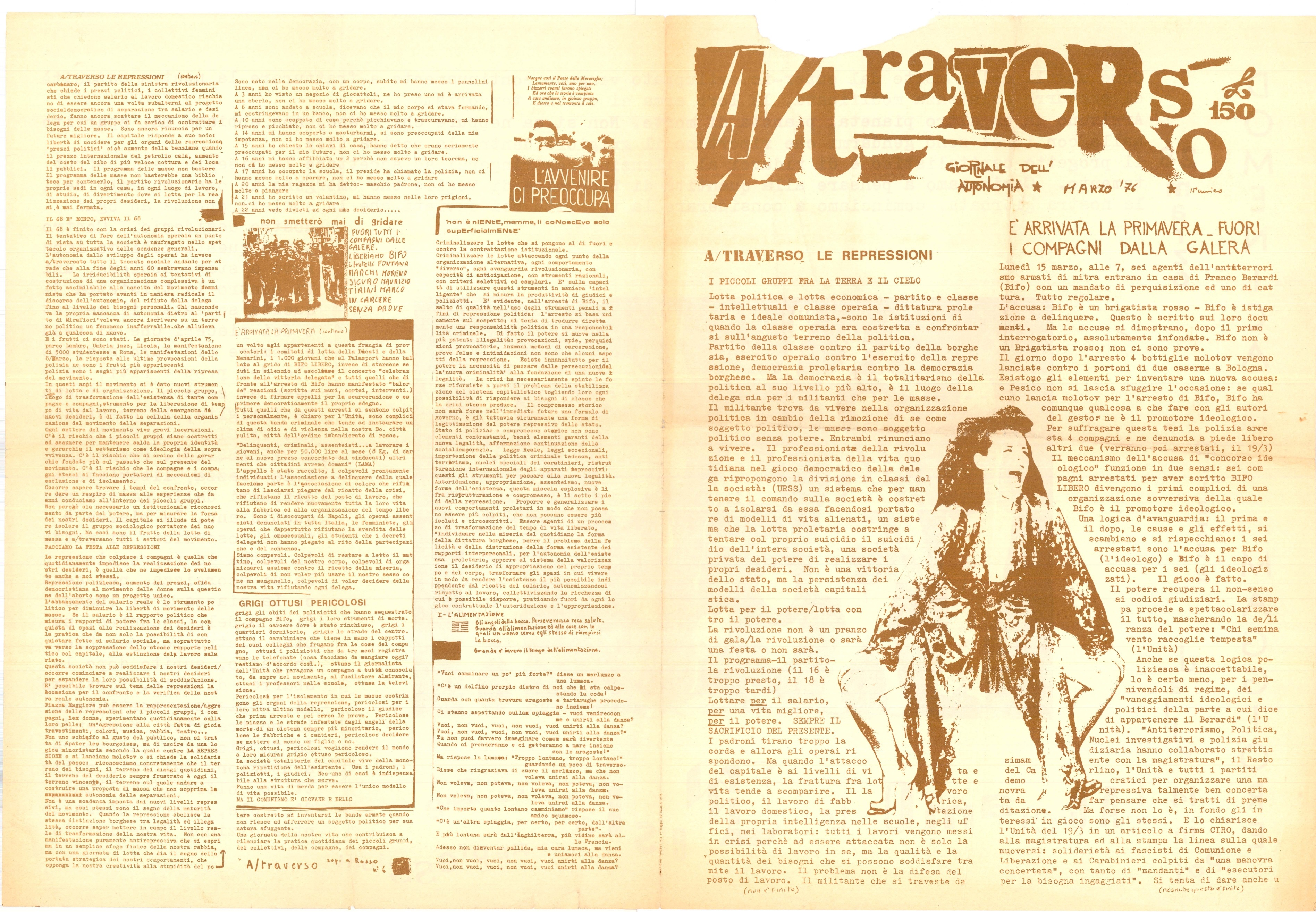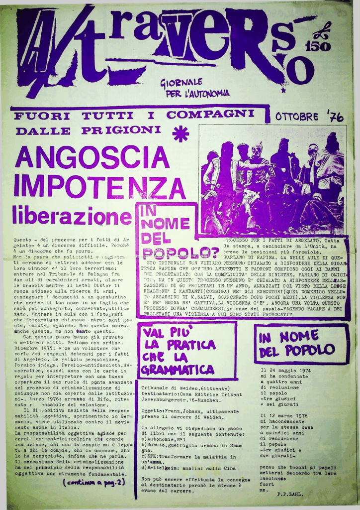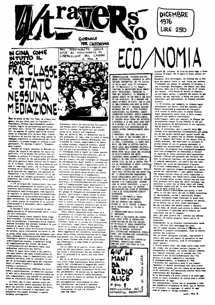 In folio (cm 31 x 44), pp. 4. Piega centrale. Stampa a caratteri viola su carta bianca. Numero dell’ottobre 1976 di questa rivista di contestazione stampata a Bologna, nata per iniziativa di Franco Berardi, detto Bifo, filosofo e principale esponente del movimento autonomo bolognese. Inizialmente militante in Potere Operaio, Berardi fu fondatore diÂquesta rivista, cruciale per il movimento. “Nel cuore della studentesca e contraddittoria Bologna, in quel microcosmo in continuo fermento, prese dunque piede l’esperienza di “A/traverso”. Al centro del quale stava la convinzione che per sovvertire il sistema imposto dal capitale occorresse rovesciarne l’ordine simbolico e i simulacri su cui esso si fonda: quelli del valore, della spettacolarizzazione (in senso debordiano), della catena di montaggio come codice imposto e prestabilito dall’alto e dell’informazione come forma di dominio e controllo. Sulla scorta delle avanguardie primonovecentesche, della neoavanguardia, di Artaud, delle teorie di Foucault, di Baudrillard e della lezione “schizo-rizomatica” di Deleuze e Guattari, gli animatori di A/traverso concepirono la scrittura come prassi in senso materialista, ossia come strategia di lotta da mettere in atto per inceppare gli ingranaggi del flusso discorsivo del potere” (Domenico Guzzo, Sai non garantiti ai precari. Il movimento del ’77 e la crisi del lavoro nell’Italia post-fordista”, 2019). In questo numero: un articolo sui fatti di Argelato, il Comunicato della brigata Bruno Valli, un articolo dal titolo “Perche’ devono sbocciare 100 fiori se poi la prateria deve bruciare?” sulla lotta armata; ecc. ITA. - Dicembre 1976 [ bologna.it ] – In cine come in tutto il mondo fra classe e stato nessuna mediazione