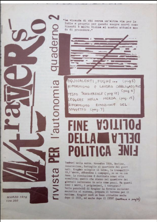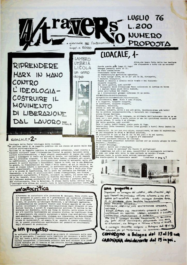 Quaderno numero due di A/traverso, storica rivista underground bolognese, pubblicata come supplemento a Rosso nel marzo 1976. - Luglio 1976 [ bologna.it ] – Riprendere Marx in mano contro l’ideologia – costruire il muovimento di liberazione dal lavoro