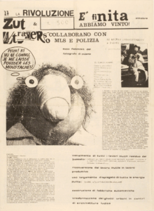 Icona editoriale del movimento del ’77, il giornale sperimenta nuove forme di scrittura che prendono spunto dalle avanguardie del Novecento, si appropria dei detournement dadaisti, rivendica una filosofia del desiderio ed esprime quella soggettivizzazione di massa che si contrappone alla politica, all’etica del lavoro – e dei sacrifici – consacrata dal Partito Comunista. Al centro il collettivo, e trasversale la direzione di marcia: è così che nasce il Maodadaismo, una teoria/pratica di scrittura che vuole abolire la separazione tra arte e vita sul terreno dell’esistenza (e non solo di quello artistico come facevano i dadaisti) e quindi sostiene il rifiuto del lavoro, e diffonde “notizie false che producano eventi veri”. Nel frattempo la stampa offset offre grandi opportunità creative che danno spazio ad una cultura dal basso dove la manualità diventa dissacrazione della forma ed espressività delle singole moltitudini. Di qui la grafica innovativa, espressione di una sperimentazione artistica nonché strumento di comunicazione sovversiva. Nel collettivo redazionale troviamo Franco Berardi (Bifo), Maurizio Torrealta, Dario Fiori, Luciano Cappelli, Claudio Cappi, Mario Canale, Piero Lo Sardo, Angelo Pasquini, Stefano Saviotti e molti altri. In ottimo stato. Numero dedicato ai giovani arrestati (per lo più per reati d’opinione) dopo i fatti di Bologna del marzo 1977 e l’uccisione di Francesco Lorusso. Stampato a inchiostro verde, in ottime condizioni. cm 43×32 pp. 8. - Ottobre 1977 [ Abebooks ] – La rivoluzione è finita. Abbiamo vinto. Zut and A/traverso. Text from the posting: