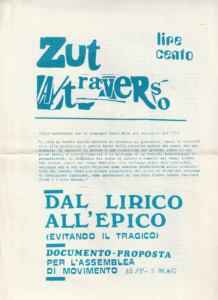 Detournement della Critica Radicale che irride il Movimento bolognese e redige questo numero falso della rivista A/traverso. cm 48×35 pp. 4.